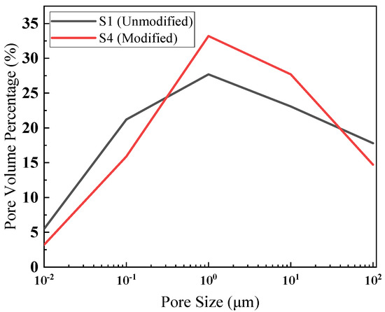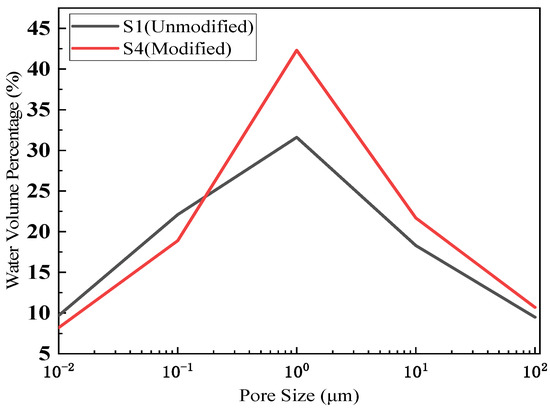 Using SEM, MIP, and 1H NMR, the optimization effect of the modifier (lignin and blast furnace slag) on the microstructure of silty clay was investigated. The samples were the unmodified sample (S1) and the best modified sample (S4), and the samples underwent different freeze-thaw cycles (0, 5, 10). Figure 15b,d shows the morphologies of the S1 and S4 samples under 1000-magnification electron microscope scanning after curing for 28 days. The mercury intrusion volume under different pressures was recorded using a mercury injection meter. Figure 16 shows the pore size distribution curve. Compared with the S1 sample and the S4 sample, the pore size distribution of the modified sample (S4) was more concentrated in the range of middle and small holes, indicating optimized pore distribution. In the 1H NMR test, samples with a saturated water state were prepared and put into a nuclear magnetic resonance instrument to measure the relaxation time distribution. Figure 17 shows that, in the S4 sample, the proportion of water in small pores increased, indicating better water retention performance and pore stability.