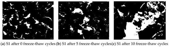 To further analyze the pore changes under freeze-thaw cycles, image recognition technology was used to binarize the SEM images [53]. The processing results are shown in Figure 18, where the black part represents particles and the white part represents pores. According to Figure 18, the pore ratio (the ratio of the pore area to the total area) of the S1 and S4 samples for different freeze-thaw cycles was calculated, as shown in Figure 19. In order to reduce the error caused by SEM, a wider sampling strategy was adopted. In the sample preparation process, multiple slices were cut from different positions (such as the center, edge, top, bottom, etc.), different directions (horizontal, vertical, etc.), and different magnifications of SEM for observation, using professional image analysis software 1.8.0 to process SEM images.