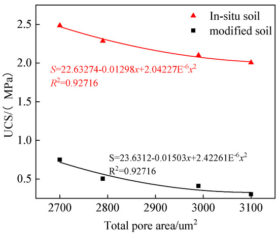 From Figure 19, it can be seen that as the number of freeze-thaw cycles increases, the porosity of the sample gradually increases, and the porosity of sample S4 is significantly reduced compared to sample S1, indicating that the addition of lignin and BFS can effectively reduce the porosity of the sample. To analyze the correlation between the mechanical properties of soil and the degree of pore damage, a Cartesian coordinate system was established between the total pore area and macroscopic mechanical strength parameters. The mathematical relationship between the two was fitted and analyzed, and the correlation coefficient exceeded 0.92; the results are shown in Figure 20. As the total pore area increases, the UCS of samples S1 and S4 gradually decreases, indicating that freeze-thaw action disrupts the arrangement and contact of soil particles, increases the porosity and pore area, weakens the bonding force between the particles, and results in the looseness of soil structure and the decrease in soil strength. In the same pore area, the UCS strength of the S4 sample is much higher than that of the S1 sample, indicating that lignin and BFS have a significant effect on improving the mechanical properties of silty clay.