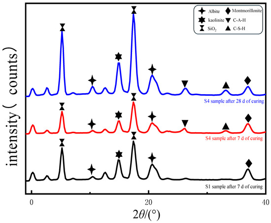 The selection of the S1 sample after curing for 7 days and the S4 sample after curing for 7 days and 28 days for the XRD study was mainly based on the following reasons. For the control group without added lignin and BFS (BFS), the XRD results of sample S1 show the mineral composition of the original soil, providing a basis for subsequent comparison. The S4 sample has shown good performance in previous tests of unconfined compressive strength, CBR, the resilience modulus, the freeze-thaw cycle, etc. It can be selected to explore changes in soil mineral composition after different curing times under the action of this specific ratio of lignin and BFS, so as to further understand the influence mechanism of the modifier on the soil mineral structure. The comparison of the S4 samples with a curing time of 7 days and 28 days is helpful to study the chemical reaction and mineral transformation process of the modified system over time and to explain its influence on the long-term soil properties from the microscopic level. This is closely related to the whole study of lignin-BFS-modified silty clay and can complement other test results, making the research more comprehensive and systematic.