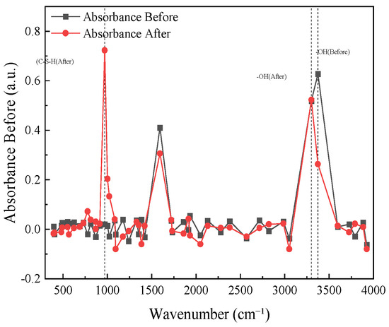 As seen in Figure 22, FTIR technology can detect the vibration absorption of molecules to analyze the changes of chemical bonds and functional groups, which is of great significance to study the mechanism of lignin-BFS-modified silty clay. The absorption peak of lignin functional groups changed before and after modification. Before modification, the stretching vibration peak of the lignin alcohol hydroxyl group (-OH) was around 3374 cm−1. After modification, if the functional groups involved in the reaction, such as hydroxyl, to form hydrogen bonds, the relevant peak position, strength, benzene ring C=C bond, alkane (C-H (CH2)), primary alcohol (R1-CH2-OH) and secondary alcohol (R1-CH(R2)-OH), and other functional group peaks will also change accordingly. The interaction with BFS and clay was reflected. BFS hydration products have characteristic peaks in FTIR, which can be used to determine the degree of hydration reaction and the products and to understand its role in strengthening soil strength. FTIR is combined with XRD and SEM. XRD provides crystal structure information, FTIR supplements chemical bond analysis and explains the reasons for structural changes, and SEM displays the microscopic morphology to jointly build a complete understanding of the modification mechanism.