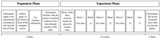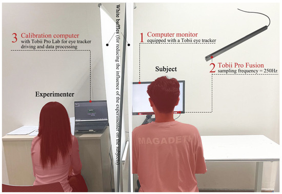 For the test, the Tobii Pro Fusion (250 Hz) eye tracker attached to a 21.5-inch monitor with a resolution of 1920 × 1080 pixels was used to record the participants’ eye movement data. The eye tracker used in this study was a Tobii Pro Fusion (Tobii AB, Danderyd, Sweden) with dimensions of 374 mm × 18 mm × 13.7 mm and a capture speed of 250 Hz. The eye tracker was mounted on the underside of the laptop screen and linked to the computer via USB. Tobii Pro Lab (Tobii AB, Danderyd, Sweden, version 1.207) software was also installed on the computer for device management, data calibration, and subsequent data analysis. The specific experimental process is as follows (Figure 3).