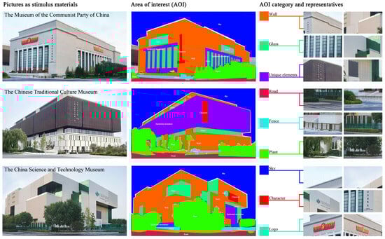 The purpose of this study is to explore how different types of built environment elements that make up the museum’s facade and surrounding environment affect the viewer’s emotional experience by affecting the urban visual quality. This study selected three representative urban museum built in past two years in Beijing central axis museum group to explore the urban visual environment they create and the emotional experience they bring to people, including The Chinese Traditional Culture Museum, the Museum of the Communist Party of China, and the China Science and Technology Museum. Due to the limitations of experimental space and access control of colleges in the post-pandemic era, the participants finally recruited in this study were college students aged 20–25. In addition, previous eye tracking studies on visual preferences of landscape space showed that whether the participants studied spatial design-related majors would affect their attention to spatial elements [31,32,33]. Therefore, the major of the participants recruited in this study were also included in the latent variables of individual differences. Based on the research purpose and combined with the specific characteristics of the three selected museums, the built environment elements are divided into three categories, artificial elements, natural elements, and interactive elements, and the following research hypotheses are proposed: