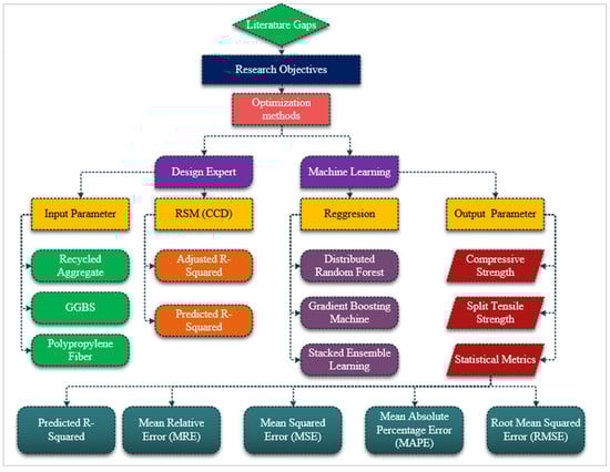 Figure 1 shows the process of the optimization methods, including the Design of Experiments (DoE) and machine learning methods, which were then applied. DoE uses Response Surface Methodology (RSM) with Central Composite Design (CCD) to evaluate the effects of input parameters like Polypropylene Fiber (PPF), Ground Granulated Blast Furnace Slag (GGBS), and Recycled Aggregates (RAs). Design-Expert 13 software was utilized for RSM, whereas H2O.ai software was employed for machine learning analysis. Concurrently, ensemble learning methods with regressors such as distributed random forest, stacked ensemble, and gradient boosting machine predict output parameters like compressive and split tensile strength. Model performance is evaluated using R-squared (R2), Mean Squared Error (MSE), Root Mean Squared Error (RMSE), Mean Relative Error (MRE), and Mean Absolute Percentage Error (MAPE). This integrated approach ensures accurate prediction and optimization of input parameters, effectively meeting the research objectives.