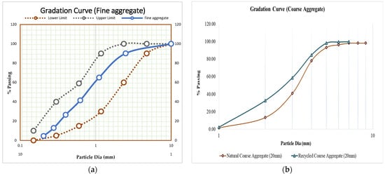 Gradation curves of (a) fine aggregates; (b) coarse aggregates.