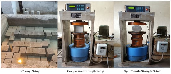 The casting and curing procedure involved cleaning and oiling the molds, dry mixing the weighed quantities of cement and fine and coarse aggregates until a uniform color was obtained, and then adding the coarse aggregates for further dry mixing. The measured water was added to two equal parts, with the superplasticizer mixed into the second part before being added. The concrete mixture was then thoroughly mixed in a concrete mixer. The mixture was poured into molds in layers, each compacted with a tamping rod, and the surface was leveled with a trowel. Cubic specimens (150 mm × 150 mm × 150 mm) were cast for testing CS. Cylindrical specimens (150 mm diameter × 300 mm height) were cast for testing STS. Following molding, the specimens were submerged in a curing tank with clean water until testing at 7, 28, 56, and 90 days, ensuring proper hydration and strength development. Figure 4 shows the experimental setup.