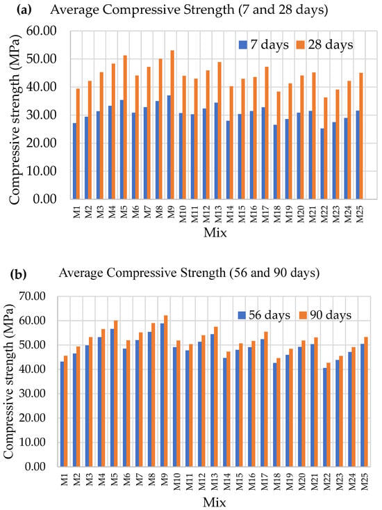 Average Compressive Strength: (a) At 7 and 28 days; (b) At 56 and 90 days.