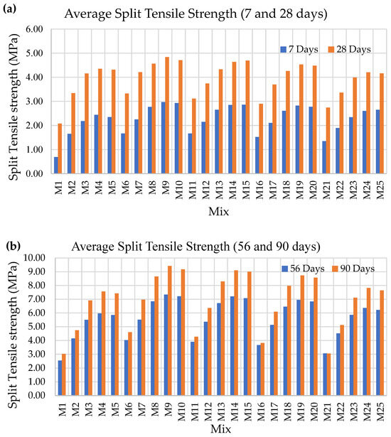 The STS results at 7, 28, 56, and 90 days are shown in Figure 6. At seven days, higher amounts of GGBS significantly improved the STS: the STS of mix M5 (0% RA, 50% GGBS, 1% PPF) increased by 240.58% (2.35 MPa), and that of mix M9 (25% RA, 37.5% GGBS, 1% PPF) increased by 330.43% (2.97 MPa) compared to that of M1 (0.69 MPa). A high RA content reduced the STS: mix M16 (75% RA, 0% GGBS, 0.75% PPF), showing a 120.29% increase (1.52 MPa). At 28 days, the tensile strength of M5 increased by 107.69% (4.32 MPa), and that of M9 increased by 132.69% (4.84 MPa) compared to that of M1 (2.08 MPa), while that of M16 increased by 39.42% (2.90 MPa). At 56 days, mix M5 showed a 130.71% increase (5.86 MPa), and mix M9 had the most significant increase, at 188.98% (7.34 MPa), compared to M1 (2.54 MPa). Mix M16 increased the impact of RA by 44.09% (3.66 MPa), but mix M25 (100% RA, 50% GGBS, 0.75% PPF) mitigated the impact of RA by 144.88% (6.22 MPa).