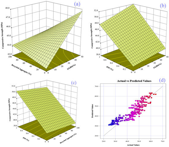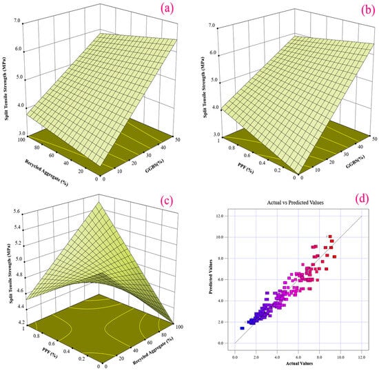 Figure 8 illustrates the response surfaces and the actual vs. predicted plot for the STS of concrete. Figure 8a–c depict the impacts of various factors on the STS. In Figure 8a, increasing the GGBS content significantly increased the STS, especially at lower levels of RA. However, as the RA content increases, the STS decreases, indicating that a higher RA content negatively impacts the strength unless adequately compensated by GGBS [33,34,35]. Figure 8b shows that incorporating PPF in concrete improved the splitting tensile strength. Figure 8c demonstrates that increasing the RA content results in a noticeable decrease in the STS, but the presence of PPF helps to mitigate this reduction to some extent. Finally, Figure 8d shows the actual vs. predicted STS values, with points closely following the 45-degree line, indicating high model accuracy. Overall, these plots emphasize the importance of optimizing the balance between RA, GGBS, and PPF to achieve the desired STS in concrete.