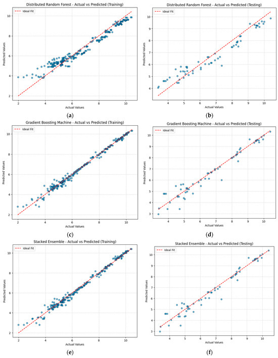 The Stacked Ensemble Learning model also exhibits a high correlation during the training phase (Figure 9e), with an R2 value of 0.98775, indicating that it can effectively combine the strengths of various base learners. In the testing phase (Figure 9f), the model continues to perform well, maintaining a strong correlation with an R2 value of 0.95443. This consistency in performance across both phases underscores the reliability and robustness of the Stacked Ensemble Learning model.