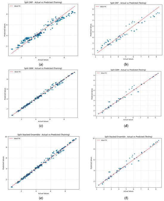 Measured vs. predicted split tensile strength using (a,b) Random Forest; (c,d) Gradient Boosting; (e,f) Stacked Ensemble Models.