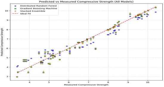 The scatter plot for compressive strength is shown in Figure 11, for three models: Distributed Random Forest, Gradient Boosting Machine, and Stacked Ensemble Learning. Among these, the Gradient Boosting Machine demonstrates the best predictive accuracy, with its predictions closely aligning with the measured values, indicating robust performance. The Stacked Ensemble Learning model also shows strong performance, but the Gradient Boosting Machine consistently exhibits superior reliability and precision. In contrast, the Distributed Random Forest model displays greater variability and less precision. Overall, the Gradient Boosting Machine stands out as the most effective method for predicting compressive strength.