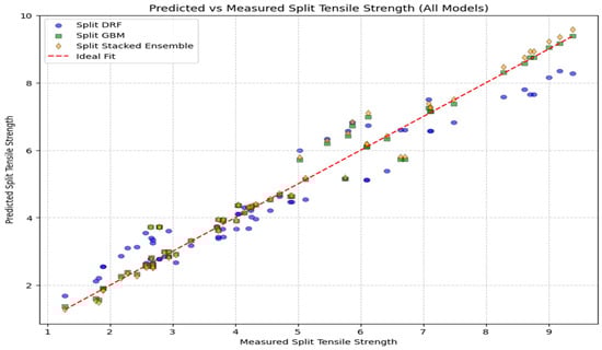 The scatter plot for split tensile strengths is shown in Figure 12, for three models: Distributed Random Forest, Gradient Boosting Machine, and Stacked Ensemble Learning. Among these, the Gradient Boosting Machine demonstrates the best predictive accuracy, with its predictions closely aligning with the measured values, indicating robust performance. The Stacked Ensemble Learning model also shows strong performance, but the Gradient Boosting Machine consistently exhibits superior reliability and precision. In contrast, the Distributed Random Forest model displays greater variability and less precision. Overall, the Gradient Boosting Machine stands out as the most effective method for predicting split tensile strength.