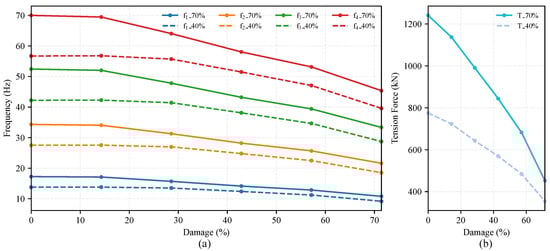 Degradation curves for different damage levels of a tendon, extracted from the experimental results of [3]. (a) Evolution of the first four natural frequencies for two tendons: tendon stressed at 70% of its ultimate stressing force (solid line), and tendon stressed at 40% of its ultimate stressing force (dashed line). (b) Tension force estimation for both tendons.