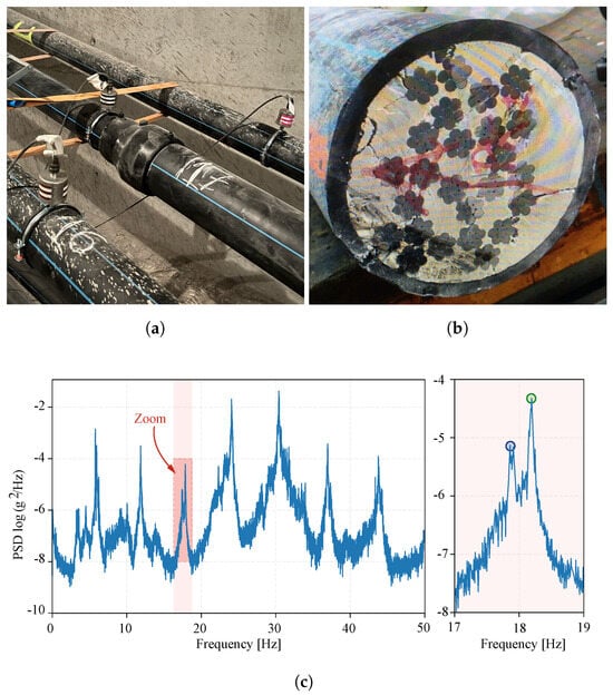 (a) High -sensitivity accelerometer attached to tendon using a bolted collar-clamp system. (b) Cross-section of a grouted tendon after its replacement. (c) PSD for the seven lowest natural frequencies and zoom of one of them (displaying doublets).