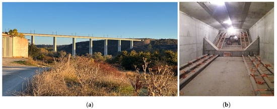 The bridge used for this study is a 12-span continuous railway bridge belonging to the high-speed railway line between Madrid and Barcelona (Spain). The bridge has a single-cell box-girder section with six external polygonal post-tensioning tendons anchoring at the diaphragms and with two deviators per span. Some bridge tendons have suffered corrosion and have been replaced. Hence, the post-tensioning system accounts for former grouted tendons and new ungrouted tendons (unbonded). Figure 3a shows a general outside view, while Figure 3b shows an inside view of the box-girder section.
