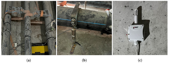Regarding frequency estimation in external tendons, there are several issues that have to be carefully considered despite the evident correlation between frequency and damage. First, there is the issue of how to capture the dynamic response in tendons with or without filling grout between the strands and the external protective duct [5]. For grouted tendons, it has been demonstrated that a bolted collar-clamp system attached to the external duct and the use of high-sensitivity accelerometers will allow for the capture of the dynamic response of tendons (Figure 2a). The second issue is related to the position and number of accelerometers used regarding the number of vibration modes to be extracted. It has been demonstrated that a single accelerometer adequately placed can capture several natural frequencies (up to a high order) without losing frequency orders. Although the use of more accelerometers allows the risk of losing frequency orders to be reduced and allows mode shapes to be included in the model-updating procedure for tension estimation, the authors have demonstrated that the use of a single correctly placed high-sensitivity accelerometer is sufficiently precise to capture the tendon’s dynamics. The third issue is related to well-known double-peak effects (known frequently as doublets) [13]. Although the tendons mainly vibrate in the in-plane (vertical) direction, out-of-plane vibrations are also measured by a single uni-axial accelerometer. Due to the non-uniform strand arrangement inside the tendons (Figure 2b) and different free lengths due mainly to different contact points at deviators, two peaks may be detected in the frequencies’ spectra. Figure 2c shows the power spectral density (PSD) of one of the accelerometers of Figure 2a for the seven lowest natural frequencies. As can observed, in some frequencies, doublets are detected; this issue has to be considered through the whole monitoring process. The fourth issue is related to the temperature dependency of the tendon’s frequency, which should be properly treated in order to assess the origin of changes in frequency and, subsequently, in tension force estimation. That is, under the influence of temperature effects, abnormal variations in tendon forces may be difficult to distinguish.