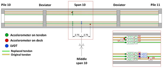 Figure 5 shows the location of the sensor at span 10. The two LVDTs are installed on T4 and T5 at the mid-span of the horizontal segment. Note that T3 and T5 are new, unbonded tendons and the other four are original, bonded tendons. The location of the accelerometer is an important parameter as it determines the capability of the system to detect natural frequencies. The proposed position should maximize the observability of the objective frequencies. The location for the accelerometers was chosen as L/8 (2.75 m) from the middle of the tendon span. This location was selected based on the capability of the sensor to reliably capture the first seven natural frequencies from frequency spectra.