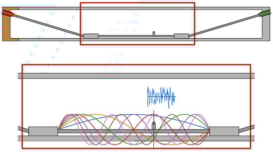 From the previous analysis, the free (equivalent) lengths were derived, and it was concluded that a location between L/8 and L/9 from the mid-span allows the first seven natural frequencies to be captured effectively. To illustrate this decision, Figure 6 displays the first seven natural modal shapes, showing that the selected range between L/8 and L/9 from the mid-span is a convenient location for the accelerometers, as the mode shapes of of interest are observed.
