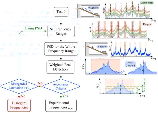 The frequency identification is initialized from an initial test (Test 0 in Figure 7) to establish the number of frequencies to track () and the frequency ranges ( and ) for each one. This test also allows us to assess if the sensor location is adequate for capturing the N frequencies. These frequency ranges are referred to as frequency sectors from now on. Thus, from each frequency sector, the weighted frequency using the PSD values is the frequency adopted, and it is calculated as follows: