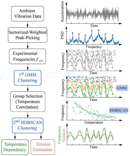 Once a meaningful group has been selected from the first clustering, a second clustering is carried out, which is, in this case, based on the temperature–frequency framework. The objective of this second clustering is to eliminate outliers from the previous selected group. Thus, the hierarchical density-based spatial clustering for applications with noise (HDBSCAN) is proposed to be used. This is an agglomerative clustering method that builds a hierarchy of clusters based on the density of data points and their proximity. It uses a minimum number of data points as a threshold to form clusters and evaluates the stability and persistence of these clusters to select the most meaningful ones. HDBSCAN is a hard clustering method, that is, each data point is assigned to only one cluster or classified as noise. HDBSCAN identifies outliers as noise, and they are grouped in a cluster known as the −1 cluster. This cluster is finally eliminated. Note that HDBSCAN is an alternative to be used in the second clustering, since natural frequencies are well separated in the case of cables and tendons; otherwise, a different method should be adopted. Figure 8 shows the flowchart of the proposed two-cascade clustering.