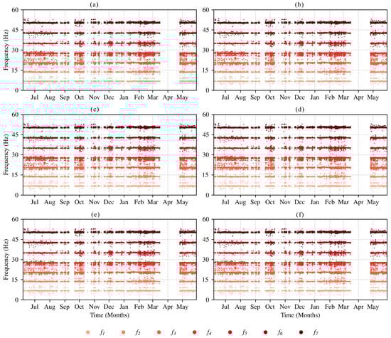 First seven frequency estimates for the six tendons over one year of monitoring. (a) T1. (b) T2. (c) T3. (d) T4. (e) T5. (f) T6.