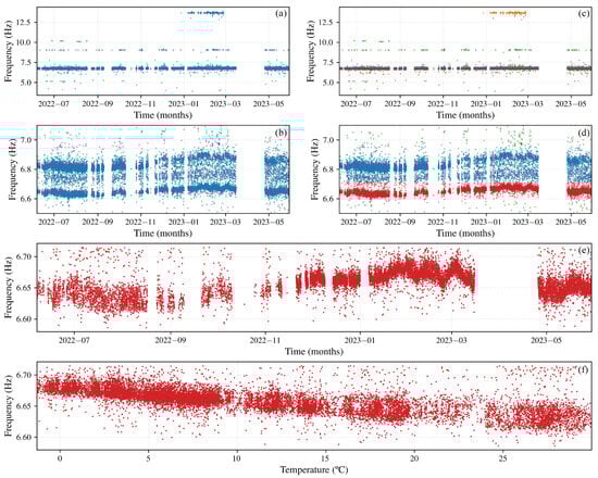Application of first clustering. (a) Example of a series of frequency estimates with time. (b) Zoom to most frequency estimates. (c) View of (a) after first clustering. (d) View of (b) after first clustering. (e) Selected group shown in the time–frequency framework. (f) Selected group shown in the temperature–frequency framework. Group colors are those indicated in Table 3 for (c–f).