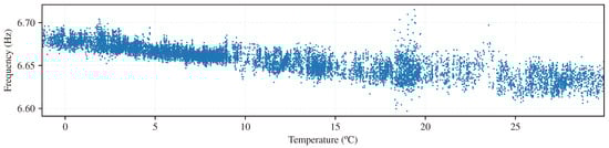In order to illustrate the use of the selected frequency estimates from the clustering process, correlation models with temperature are derived. Thus, two regression models, linear and polynomial (third-order), are devised by minimizing the mean-root-squared error. As an example, both correlation models for the first frequency estimation are shown in Figure 14 together with the error distributions. For this case and for all tendons and frequency orders, frequency estimates show a monotonically decreasing trend with temperature, resulting in a negative correlation between them. The models show very similar results, albeit the polynomial model gives a slightly lower value for the mean-root-squared error, being 2.74% lower than the lineal model.