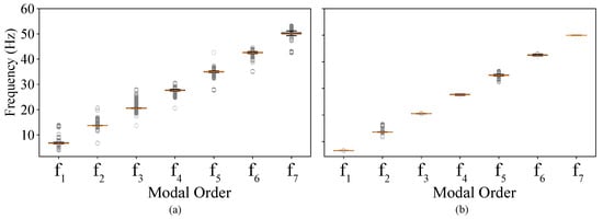 After the second clustering using HDBSCAN, the final selected group with the outliers eliminated is obtained (Figure 11). After this second clustering, a final refinement of the frequency estimates is carried out, showing less variability as compared to Figure 10f. Moreover, Figure 12 shows two boxplots for the seven natural frequencies for T1 before (a) and after (b) the second cascade clustering is carried out. The efficiency of eliminating outliers and, thus, reducing excessive variation can be observed in Figure 13. The orange histogram represents the variation from the mean value in the initial estimates before cascade clustering, while the blue histogram represents the variation in the filtered data after the cascade clustering process.