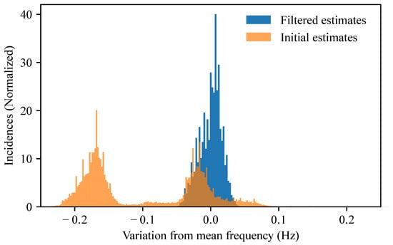Histogram of frequency estimates with respect to the mean value for the first frequency of T1 before (orange) and after the cascade clustering process (blue).