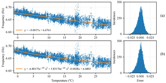Temperature correlation models for the first frequency estimates of T1. (a) Linear model and its error. (b) Third-order polynomial model and its error.