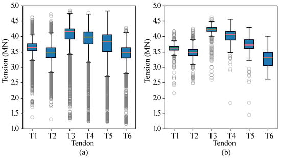 Boxplot of estimated tension forces in the six monitored tendons over the year. (a) Before clustering. (b) After clustering.