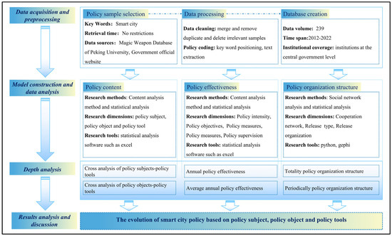 As research has become increasingly sophisticated, the policy science research paradigm has evolved from a qualitative approach, relying on empirical evidence, to a quantitative methodology based on data models. This shift has positioned the paradigm as a prominent approach within the field of policy research in recent years. This shift in the research paradigm offers a potential avenue for reducing the excessive subjectivity and uncertainty that have historically characterized the paradigm of policy science research. The information presented in the policy text illustrates the inter-sectoral collaboration and the extent of policy integration within the context of smart city development. The analytical framework of this study is comprised of three distinct parts: a content analysis of smart city policies, an analysis of the organizational structure of such policies, and an analysis of their effectiveness. The research methods employed primarily comprise text content mining analysis, social network analysis, and a quantitative analysis of policy effectiveness. Regarding the dimensions of policy effectiveness analysis, this study establishes a quantitative model of policy effectiveness comprising five dimensions: policy intensity, policy objectives, policy measures, policy feedback, and policy supervision. This study incorporates the three dimensions of smart city policy content analysis, smart city policy effectiveness analysis, and smart city policy organizational structure analysis into the smart city policy evolution analysis framework. This approach allows for a more comprehensive understanding of the goal orientation of the smart city policy system and its evolutionary trends [34]. The research framework is illustrated in Figure 1.
