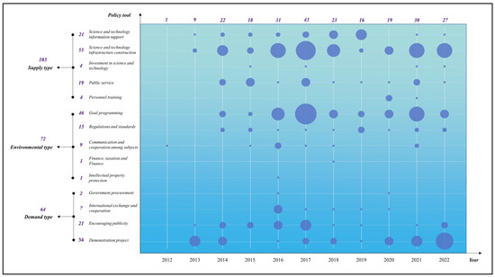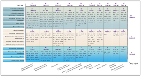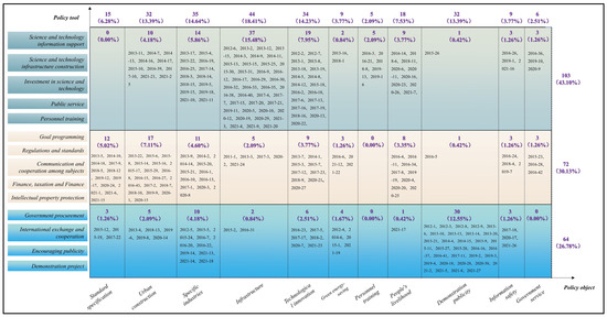The policy object (goal) is the concentrated embodiment of the theme of the policy text [42]. To promote the development of smart cities, government departments have matched different policy tool combinations in each dimension of policy elements, presenting a diverse distribution. According to the two-dimensional cross-analysis matrix of the basic policy tools and objectives, a comprehensive statistical analysis of smart city policy texts is carried out, and the distribution results shown in Figure 4 are obtained.