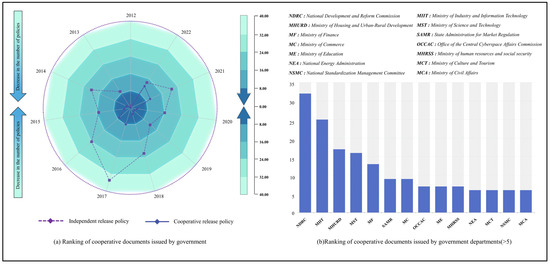 In addition to the form of policy release mentioned above, the type of publication should also include the cooperation of the main body of the paper. Furthermore, multi-department cooperation can reflect the status of smart city construction in social and economic activities to a certain extent. The results reveal that, among the 239 smart city policy texts collected, 189 were released individually, and 50 were released jointly. The specific time series distribution is shown in Figure 5. The figure shows that the number of independent papers in the research period is significantly greater than the number of cooperative papers, with the largest number of independent papers coming from the NASMGI. For a long time, the department has released a series of policies on the construction of and personnel training for spatiotemporal big data platforms for smart cities. However, its interaction with other government agencies is minimal, which is not conducive to forming policy synergies. The NDRC is the organization that cooperates and leads the greatest number of papers. This result is determined by the inherent overall planning and top-level design of the NDRC. Significantly, following the slowdown in smart city building, the annual production of collaborative papers on smart city-related policies has risen since 2018. This phenomenon is indicative of the holistic and synergistic nature of government work in the process of developing smart cities. Firstly, as different departments are typically responsible for distinct areas, but many social problems are complex and comprehensive, it is challenging for a single department to address them in isolation. The issuance of smart city-related policy documents through multi-departmental collaboration allows for the integration of resources and the complementation of strengths, thereby forming policy synergies and addressing challenges and problems in the process of smart city construction in a more comprehensive and systematic manner. Secondly, it facilitates the enhancement of policy science and efficacy. The expertise and data held by different departments can be fully integrated through collaboration, allowing for more in-depth analysis and research on the issues. This enables the formulation of more scientific, reasonable, and practical policy measures. This increases the likelihood of the policy achieving its intended outcomes and meeting its policy objectives during the implementation phase. Moreover, it bolsters the authority and credibility of the policy. The unified stance of multiple departments conveys a clear and unwavering commitment from the government on a given matter. This instills confidence and assurance in the public and other stakeholders, underscoring the government’s gravity and resolve in matters pertaining to the advancement of smart cities. Consequently, there is a greater inclination to trust and endorse the implementation of the policy. Furthermore, the sharing and communication of information between departments is facilitated. In the process of collaboration, frequent communication and exchange of opinions and data between departments is required. This breaks down the information barriers between departments, improves administrative efficiency, and lays a good foundation for future cooperation [47].