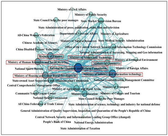 The results show that the NDRC is the core node of the smart city-related policy issuance network, and the structure of the core network with the NDRC, MIIT, MC, MHURD, MF, and MST has basically been formed. Moreover, the width of the link path between nodes indicates the degree of cooperation between the institutions. The results show the closest cooperative relationship between the NDRC, MIIT, and MST. Among them, the MST and MIIT are the main departments responsible for technological innovation and informatization at the national level. However, they can only cooperate with comprehensive management departments, such as the NDRC, MF, and MC, as well as special financial projects, because of the limited ability of specific functional departments to mobilize policy resources. The cooperation of management departments can compensate for their lack of administrative power and achieve the effect of comprehensively exerting multiple policy tools across departments.