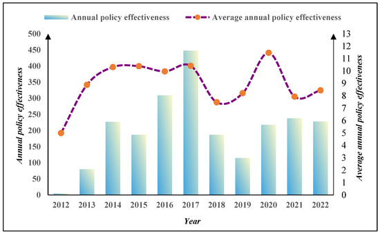As shown in Table 1. The policy texts were coded precisely, and this study provides examples of how the codes were coded. For instance, the code “2016-12” corresponds to the 12th smart city policy document issued in 2016. The calculation of the annual policy effectiveness (APE) is elaborated upon in the subsequent section. To ensure the reliability of the coding process, two postgraduate researchers specializing in smart cities and urban governance were independently tasked with coding the selected policy documents. This independent approach enhanced the credibility of the policy text coding. Upon completing the initial coding, the two coders independently recorded their results and conducted a mutual assessment reliability test to validate the objectivity and precision of the coding outcomes. If the results of the pre- and post-coding were consistent, it was noted as “1”. If there is no such evidence, it is noted as “0”. If the coding results of the two are highly consistent, the reliability of the scorers in this study is higher [36]. Based on this approach, the agreement rates between the coders and the original coding results were 86.19% and 82.43%, respectively. Furthermore, the overall consistency between the two coders exceeded 80%, underscoring the credibility and reliability of the smart city policy text coding process [37,38].