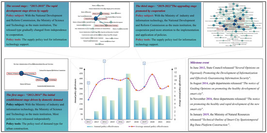 Figure 8 illustrates the trajectory of smart city policy evolution in China over the course of the study period. In conjunction with the findings of the preceding paper concerning the dimensions of the number of smart city issuances, policy effectiveness, and key features of changes in the issuance network, classifying the stages of smart city policy evolution, this study delineates three distinct phases in the evolution of China’s smart city policy during the study period: 2011–2013, 2014–2016, and 2017–2022. The specific evolution stages of smart cities are as follows.