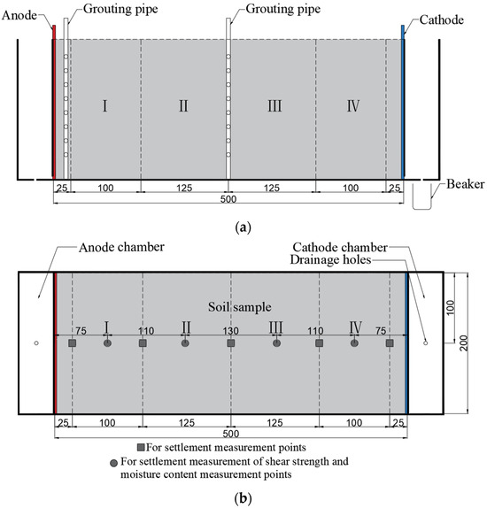 During the initial phase of the experiment, when the changes in values were rapid, the weight of the water collected in the measuring cup was recorded every hour to calculate the drainage rate. The discharged water from each time interval was collected separately in bottles for inductively coupled plasma mass spectrometry (ICP-MS) analysis. Current values within the soil were also recorded from the power supply. After 12 h, as the rate of change slowed, measurements were taken every 2 h, and the collected water was also stored separately. Following the injection of Na2SiO3 solution, the ion concentration in the effluent could vary significantly. Therefore, effluent samples were collected every hour for the first four hours, with a total of four collections. Afterward, the effluent was collected every four hours. After 20 h of testing, measurements and sample collections continued at four-hour intervals. When the drainage rate of all experimental groups dropped below 5 mL/h, electroosmotic drainage was terminated, and the DC power supply was disconnected to conclude the experiment [26].