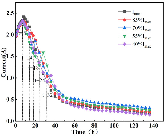 The variations in soil current for each experimental group are shown in Figure 2. In all five groups, 100 mL of 0.5 mol/L CaCl2 solution was injected at the start of electro-osmosis. During the initial phase, the current gradually increased, reaching a maximum value of 2.3 A at the 7th hour for all groups, after which it began to decline. Na2SiO3 solution was injected into the central pipe at different current values. During electro-osmosis, fine cracks developed in the soil, and the Na2SiO3 solution partially filled these cracks, reducing interface resistance and introducing a substantial number of cations, which caused a noticeable surge in current. Comparing the amplitude of the current surges across experimental groups, it was observed that delaying the Na2SiO3 injection appropriately resulted in a higher surge amplitude. However, injecting Na2SiO3 too late led to a diminished current surge. This was because, in the later stages of the experiment, large cracks had already formed in the soil. While Na2SiO3 injection could mitigate some potential losses, the overall resistance remained high, leading to a less pronounced current surge.