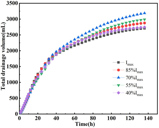 The variations in total drainage volume for each group are shown in Figure 3. Prior to the injection of Na2SiO3 solution, minimal changes in total drainage volume were observed across the groups. However, a significant increase was observed after the Na2SiO3 solution was injected. By the end of the experiment, the total drainage volumes for the S1 to S5 groups were 2705 mL, 2876 mL, 3186 mL, 2989 mL, and 2745 mL, respectively. These results indicate that adjusting the timings of sodium silicate injection can effectively increase the total drainage volume. The highest drainage volume was achieved when Na2SiO3 solution was injected when the current had decreased to 70% of its peak value. This is attributed to the fact that injecting Na2SiO3 too early leads to the formation of insoluble CaSiO3 precipitates in the middle of the soil, as SiO32− reacts with Ca2+, consuming free-moving Ca2+ ions and blocking drainage channels, thereby hindering drainage. Conversely, if the injection is delayed too long, large cracks will have already formed in the soil, reducing both the current and drainage rate and resulting in a lower overall drainage volume.