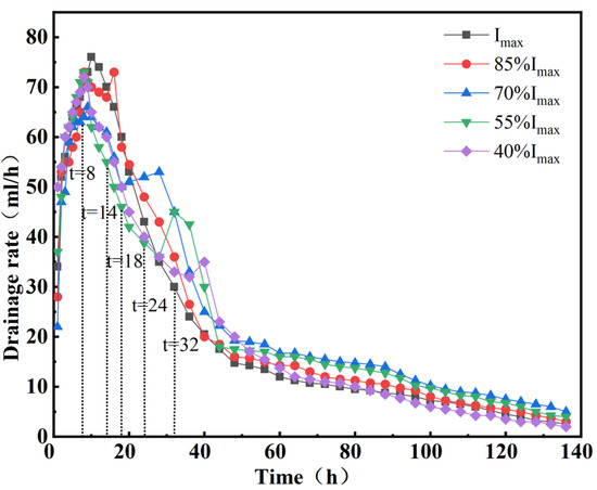 Figure 4 illustrates the changes in drainage rate over time. The trend of the drainage rate closely mirrors that of the current: it initially increases, then decreases before the injection of Na2SiO3 solution. Following the injection, the drainage rate exhibits a surge, followed by a rapid decline. This behavior is attributed to electro-osmotic drainage, which primarily depends on the movement of free cations that transport water molecules toward the cathode. The injection of Na2SiO3 solution increases the number of free-moving cations, causing a surge in the drainage rate and enhancing the drainage process. After 40 h, the drainage rate stabilizes. Comparing the current and drainage rate curves, it is evident that the S3 group maintains the highest stable drainage rate, consistent with the current trend. These observations underscore the importance of injecting CaCl2 solution at the anode at the start of electro-osmosis, followed by the timely injection of Na2SiO3 solution. Injecting Na2SiO3 too early reduces the availability of Ca2+ ions for ion exchange, leading to the formation of CaSiO3 precipitates, which block drainage channels and reduce the total drainage volume. Conversely, injecting Na2SiO3 too late, when the soil current is low and cracks are already pronounced, has minimal impact on the drainage rate and results in lower overall drainage. Injecting Na2SiO3 at the optimal timing significantly enhances the total drainage volume.