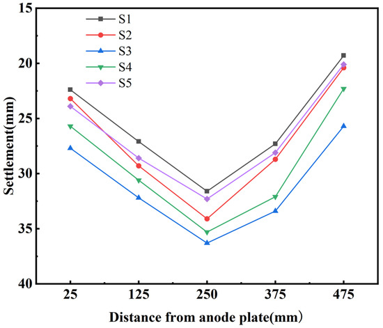 As the electro-osmosis process progresses, cations, influenced by the electric field, drag water molecules from the anode to the cathode, resulting in water discharge. This movement creates numerous pores in the soil, and under the combined effects of soil self-weight and interparticle forces, varying degrees of surface settlement occurs. Measurements taken at different points in the experimental groups using a steel ruler are shown in Figure 5. Settlement on both sides of the soil sample is consistently lower than that in the middle, with the maximum settlement observed at the center. This phenomenon is attributed to the boundary effect, as the sides of the soil are in close proximity to the electrode plates. Settlement near the anode is primarily caused by the expulsion of pore water, while the cathode area, which retains higher moisture content, becomes alkaline in the later stages of the experiment. This alkalinity promotes the formation of calcium silicate hydrate (CSH) and calcium aluminate hydrate (CAH) gels that fill the pores, resulting in minimal settlement near the cathode. In contrast, cracks develop in the middle of the soil during the later stages, causing the drainage paths to shift downward, which leads to the greatest settlement at the center. The settlement patterns across the experimental groups correspond to the drainage volume trends: groups with higher drainage volumes also exhibit higher settlement. Injecting Na2SiO3 solution too early causes significant CaSiO3 precipitate formation in the soil center. These precipitates block drainage channels, causing water to accumulate in the central region and reducing settlement. Additionally, the excessive consumption of Ca2+ ions limits the formation of cementitious materials at the cathode, further decreasing settlement. Conversely, injecting Na2SiO3 too late, when the current is already low, results in a lower overall drainage volume compared to the S3 group, leading to less settlement.