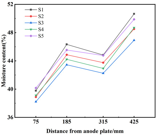 Soil samples were collected from each experimental group at designated measurement points, including the surface, middle, and bottom layers. The average of these measurements was used to determine the mean moisture content at each point, as illustrated in Figure 6. The moisture content across all five experimental groups ranged from 30% to 50%, representing a reduction of 31.4% to 45.1% compared to the initial moisture content of the remolded soil. The mean moisture content for each group followed the order S3 > S4 > S2 > S5 > S1, consistent with the trends observed in drainage volume. Regions I and III exhibited the lowest moisture content, followed by region II, while region IV had the highest moisture content. This distribution is attributed to the initial injection of CaCl2 solution at the anode, which introduced a significant amount of Ca2+ ions. The increased concentration of Ca2+ facilitated ion exchange reactions, accelerating drainage and reducing moisture content near the anode. Following the injection of Na2SiO3 solution in the middle of the soil, Na+ ions dragged water molecules toward the cathode, enhancing drainage in region III. By the end of the experiment, a considerable amount of pore water remained near the cathode, resulting in higher moisture content in that area.