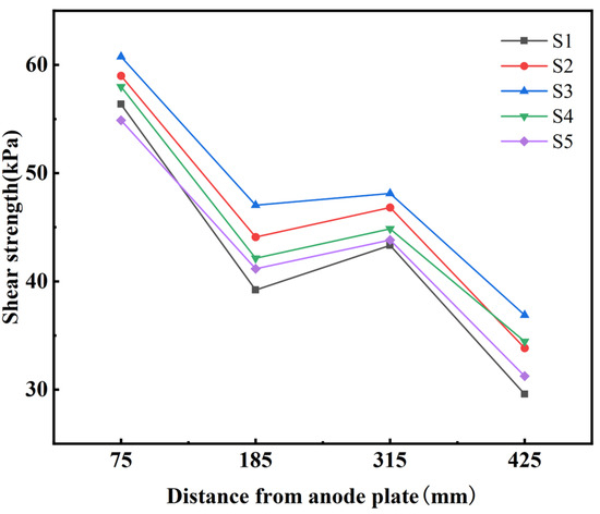 The average vane shear strength values for the sampling points of all experimental groups were calculated. The average strengths for tests S1 to S5 were 42.11 kPa, 45.94 kPa, 48.2 kPa, 44.84 kPa, and 42.78 kPa, respectively. The ratio of the strength in the anode region to that in the cathode region was defined as the unevenness coefficient. The unevenness coefficients for tests S1 to S5, under different Na2SiO3 solution injection timings, were 1.91, 1.74, 1.65, 1.69, and 1.76, respectively. Comparing the shear strength and moisture content curves, it can be concluded that under the experimental conditions of test S3, the moisture content was minimized, the average shear strength reached its maximum value of 48.2 kPa, and the unevenness coefficient was the lowest, thereby achieving the optimal reinforcement effect.