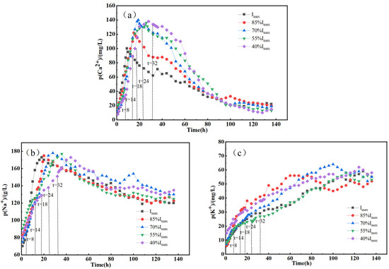 Variation in (a) Ca2+, (b) Na+, and (c) K+ ions concentration with time in the discharged water.