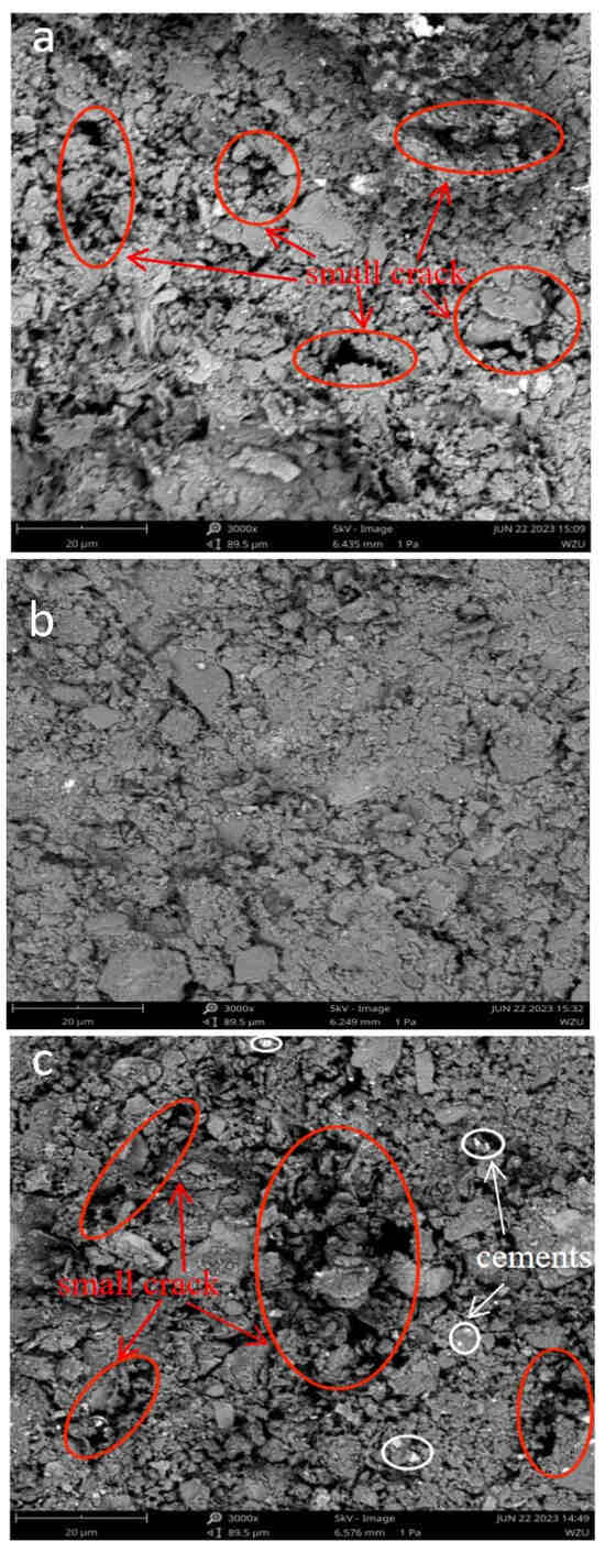 SEM image of the microstructure of soil sample at test S3 after treatment: (a) near the anode; (b) center of soil; (c) near the cathode.