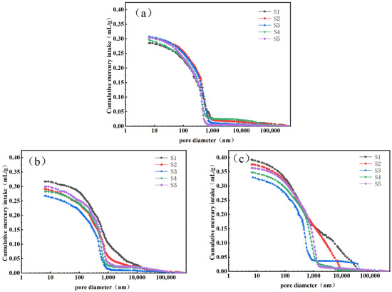 Cumulative mercury intrusion (a) near the anode, (b) near the middle, and (c) near the cathode after treatment.