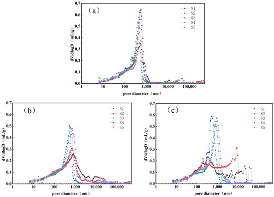 Figure 11 shows the differential pore size distribution curves for the different regions of the soil. The curves exhibit a single-peak distribution pattern, with the peak corresponding to the dominant pore size. Analysis of the anode region pore size distribution curve (Figure 11a) reveals that the timing of grouting has little effect on the pore structure in the anode region, with the dominant pore size for all experimental groups ranging between 500 and 600 nm. By comparing Figure 11b,c, it is evident that for experiment S3, where Na2SiO3 is injected when the current has decayed 70% of its peak value, the “peak” is the sharpest, indicating the largest peak value. This suggests that injecting Na2SiO3 solution at this stage results in a greater concentration around the dominant pore size, with the peak of the pore size curve shifting to the left. As a result, the dominant pore size decreases, leading to a reduction in the overall pore diameter of the soil. In the middle region, significant differences are observed in the dominant pore size, which are 850 nm, 750 nm, 550 nm, 600 nm, and 700 nm, respectively. These variations in pore size distribution correlate with the shear strength patterns, with the S3 group exhibiting the smallest dominant pore size at 550 nm, indicating a more compact and optimized soil structure. At the cathode region, the dominant pore size distribution in the T1 and T2 groups is more irregular, with a predominance of large pores and a weaker structure. This is attributed to the high moisture content in the cathode region and the limited diffusion of Na2SiO3 when injected too early, resulting in fewer cementitious materials and inadequate reinforcement. The dominant pore sizes for the remaining three groups are 600 nm, 800 nm, and 900 nm, showing a pattern consistent with that observed in the middle region.