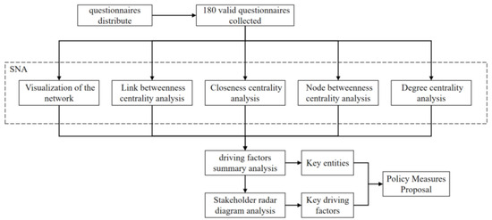 This study employs a questionnaire survey methodology to gather pertinent data regarding the assessment of the interrelationships among driving factors as perceived by the participants. Additionally, a comprehensive analysis of the relationships among these driving factors was undertaken by utilizing Social Network Analysis (SNA) [72]. The methodology flow chart is shown in Figure 1.